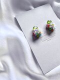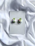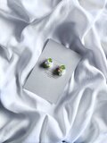 つるんとした形が瑞々しいペリドットと、原色トーンのフランスビンテージビーズが美しい耳飾りです。