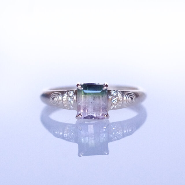 バイカラートルマリンとダイヤモンドのK10製、1点ものリングです。