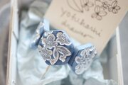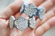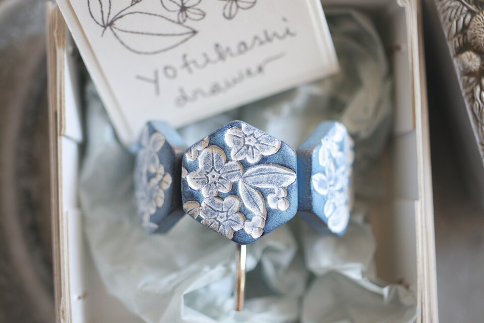 草花をモチーフに消しゴムはんこを彫り、はんこを陶土に捺しつけて凹凸の模様をつけたポニーフックです。