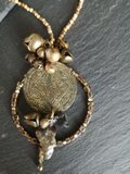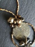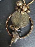 大きなコインのようなモロッコのビンテージトップと、先端にはそれぞれ深みのある印象のエチオピアンオパールが2つ、大小様々な鈴が実り、アフリカの雄大な大地を想像させる雰囲気のネックレスです。