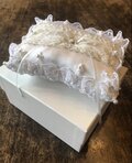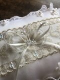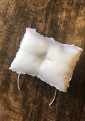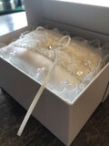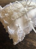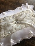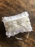 シャンパンゴールドの繊細なレースで装飾した小さめのリングピローです。側面にもぐるりと一周美しいモチーフレースをつけました。中央にリングをかけるリボンを配置しています。パールやスパンコールの装飾で可愛らしく華やかな雰囲気です。
