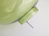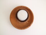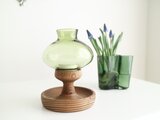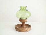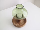 上下セパレートになっていて、上部はライトグリーンのガラス、下の台座は木製でティーキャンドルを置くことができます。ガラスフォルムの丸い曲線が美しい作品です。