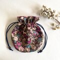 リバティタナローン生地を使って、ころんと丸い巾着ポーチを作りました。