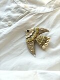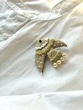 羽の部分には、ザラメのようなきらっとした輝きをもつちいさなガラスビーズを散りばめ、ブローチの角度や動きによってきらりと輝きを感じられるようにしました。