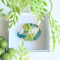 リネンに素朴な北欧風のデザインでことりとミモザを手刺繍しました。
