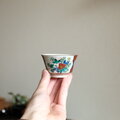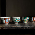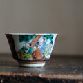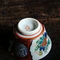 カラフルな草花◆三人のおじさん。九谷焼 赤絵金彩湯呑み 工芸品 和食器 庄三写し 昭和レトロ