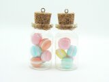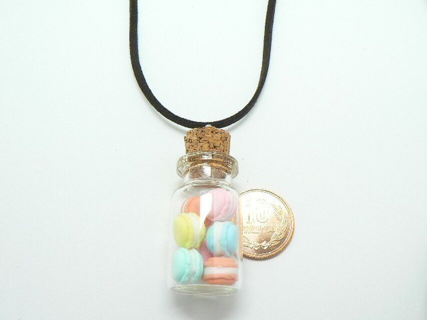 おいしそうで食べたくなるようなマカロン(樹脂粘土製でひとつずつ手作りしました)を、かわいく小瓶に詰め込み、ネックレスにしました。