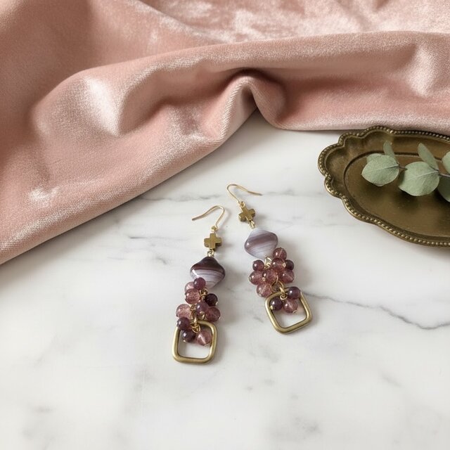 落ち着いたゴールドの四角いパーツが大人っぽさをプラスします。