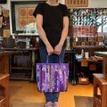 着物生地(古布)をパッチワークして牛革の持ち手を付けて作りました。