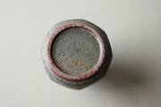 しのぎ(彫り模様)を施した後、色化粧土を塗り、灰釉をかけています。
