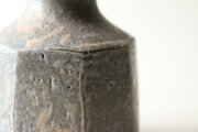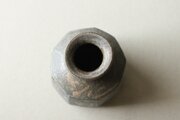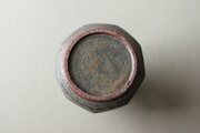 しのぎ(彫り模様)を施した後、色化粧土を塗り、灰釉をかけています。