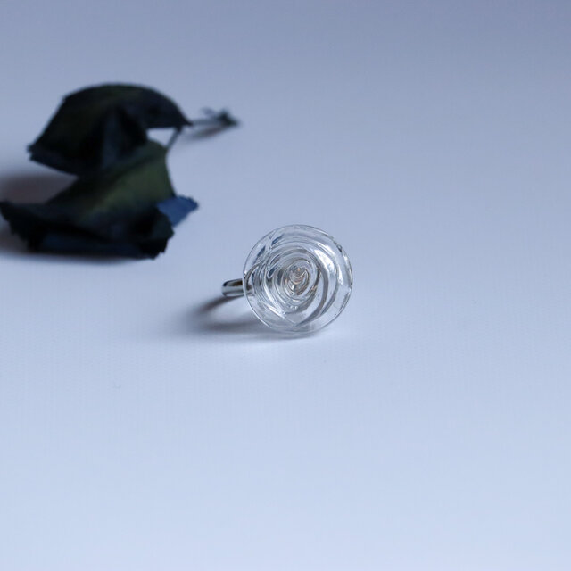 1.5cmの小ぶりなボタンには、まるで花びらの重なりのような波型の彫刻が施され、中心から大きく花を開く薔薇の姿が浮かび上がります。透明なガラスが肌の色を引き立て、指先に凛とした明るさを添えてくれます。