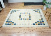 こちらのギャッベは、温かみのあるベージュを基調に、カラフルなパネルが散りばめられた、まさに一点ものの芸術品。