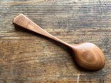 全体的にやや平たく、匙面の先が少し上向きになっています。節はなくシンプルな木目のスプーンです。