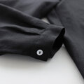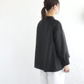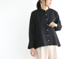 バンドカラーと前開きデザインが、シンプルながらも洗練された印象を演出。上品な貝ボタンがポイントです。