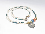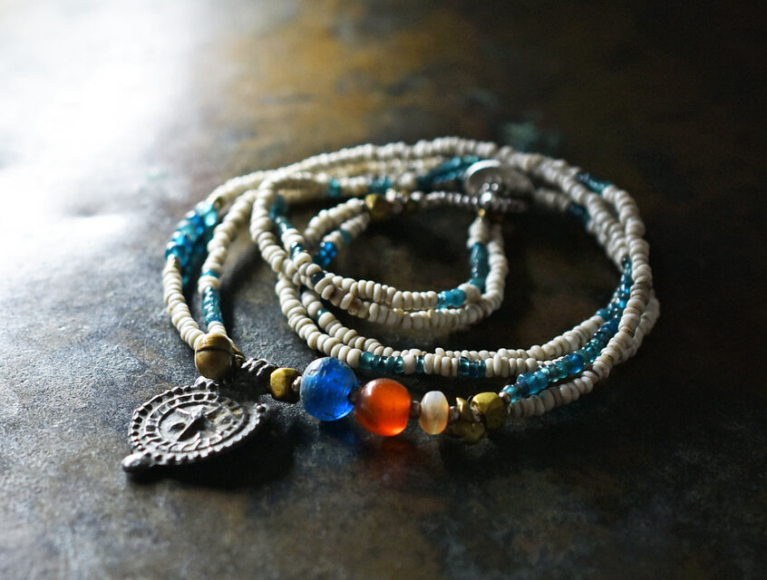 少し大き目なブルーのビーズは発掘ビーズです。ところどころにパティーナ(付着物)が見られます。