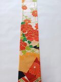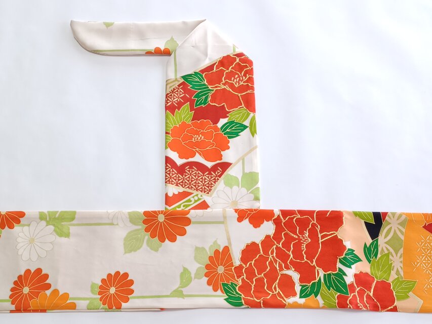 材質は不明です。染めはプリントのようですが、昭和の振袖の華やかな色柄が魅力的な一品です