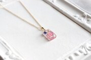 ピンク色の花びらを中心に、紫や白いお花やパール、ラメやブリオンをちりばめた可憐なペンダント。
