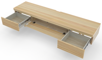 両サイドに引き出し、中央にフラップ扉を備えた収納スペースにより、AV機器やリモコン、小物類をすっきりと整理できます。引き出しはスムーズに開閉でき、フラップ扉は開けたままでも使いやすい設計になっています。