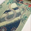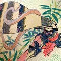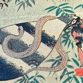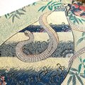 琵琶を包む色鮮やかな袋に赤目の白蛇が絡みつく。琵琶は七福神の一人として知られる弁財天の持ち物で、白蛇は弁財天の眷属(けんぞく)である。落款には弘化4(1847)年の4月20日、己巳(つちのとみ)の日(弁財天の縁日)という60日に一度の吉日に、北斎が本作を描き出した旨が記される。弁財天は財・富の他、芸術を司る神として知られるが、「真正の画工」を目指した北斎の切なる願いが本作には込められているのかもしれない。※綴より抜粋