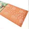 オレンジ色が鮮やかながらに柔らかく美しい織物は、七宝花紋と牡丹が散りばめられています。持ち主様の幸運を願う縁起の良い意匠です。七宝花紋は円満や子孫繁栄を象徴し、人とのご縁や繋がりが広がることを意味します。また、牡丹は富貴と華やかさを表し、人生に豊かさと幸福をもたらす吉祥の花とされています。