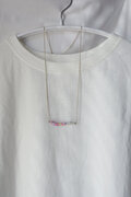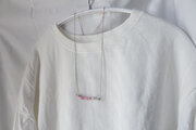 ネックレスとして仕上げたこの作品は糸にポンポンが付いた個性的な糸と、白の糸を使いふわふわした部分とシンプルな部分のコントラストが面白い1点に仕上げました。不規則なポンポンの配色がマーブルのようでとても個性的な作品です。シンプルに白Tなどに合わせていただくと素敵です。