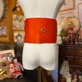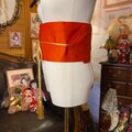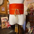 【 名古屋帯リメイク サッシュベルト 飾り帯 和洋折衷 ウエストマーク ハンドメイド レトロ 古着 LL〜4L 鮮やかな朱色と繊細な刺繍で描かれた花模様 GOB-19 】