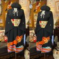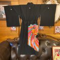 【 黒留袖 着物 リメイク ワンピース ドレス 洗える 化繊 二/2部式お太鼓 袋帯ハンドメイド レトロ 古着 和洋折衷 深い漆黒の地に描かれた鮮やかなオレンジと青の波模様 TKW-60 】