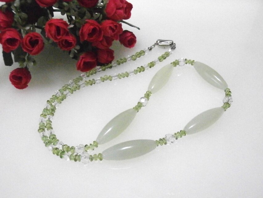 ・淡いグリーンカラーのニュージェイドを中心に組み合わせたネックレスです。