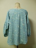 綿麻素材、水色地×生成り色動物柄プリントのラウンドネックバルーン8分丈袖のプルオーバーです♪