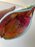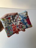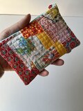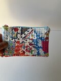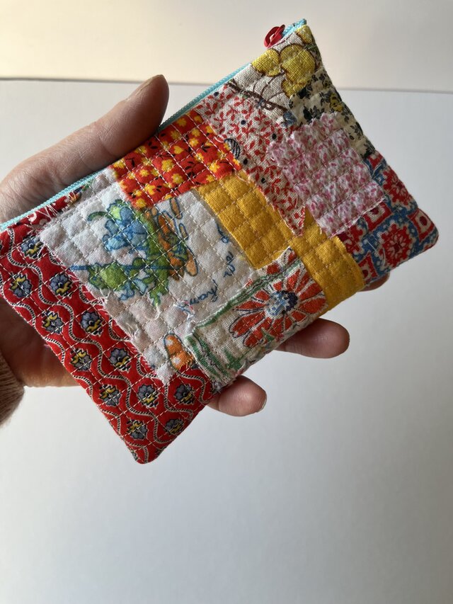 多色のパッチワークデザインで、ジッパー付きの布製小物入れ。
