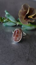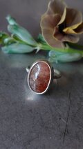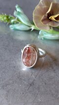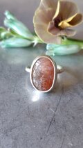 虹色に美しく煌めくバイカラーの歪で素朴な印象のイリュージョンサンストーンをシルバーリングに仕立てました。