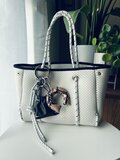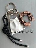 デザインからファブリック選び・カット・編み込み・手縫いステッチ…全ての工程をハンドメイドで仕上げた、トレンドのミックスバッグチャームです☆