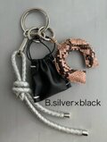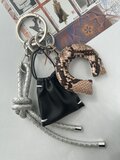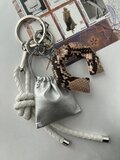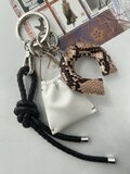 上品でクラシカルなメッシュコード、ミニミニサイズがキュートなトレンドの巾着バッグ、インパクトのあるパイソン柄モチーフクッションチャームの3点セットです
