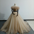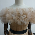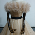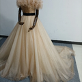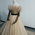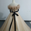 実例写真!シャンパン色 カラードレス オフショルダー キラキラチュール サッシュベルト 披露宴