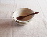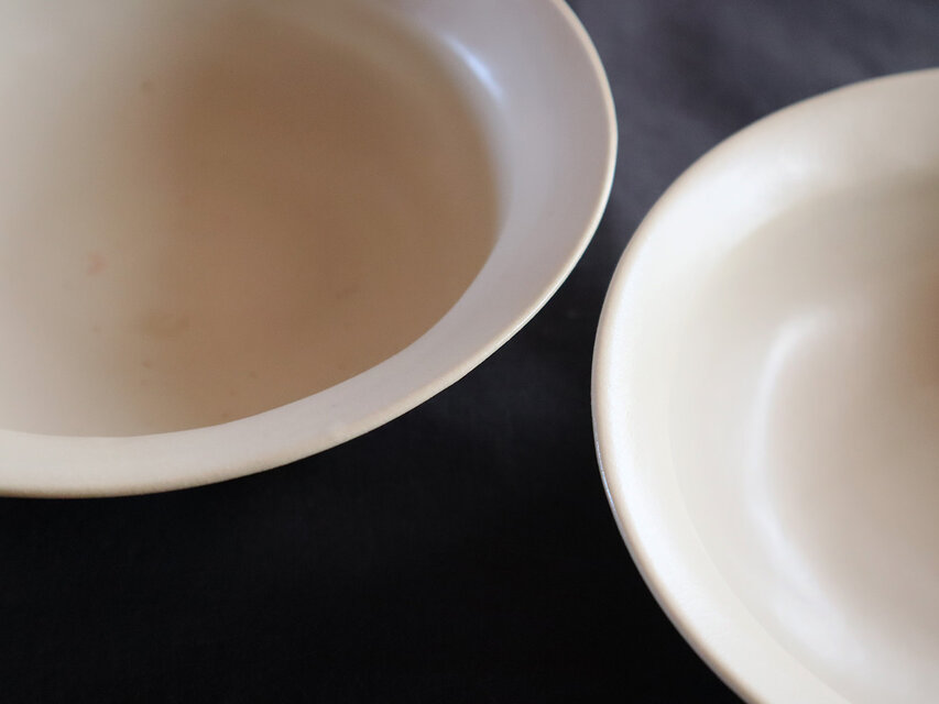 タタラで作った楕円のボウルにろくろでリムを作り合わせたもので、ひとつひとつ、たわみ方が異なり、リムの大きさも多少違いがある作品になります。ゆえに、まったりとした、優しい作品になったと感じています。