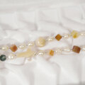 形の可愛いセミバロックの本真珠(淡水パール、ナチュラルカラー、ホワイト)、照りの綺麗な2種類の貝パーツ(茶蝶貝、クロス、ラウンド)、お菓子の様な可愛いカットのメノウ(瑪瑙、キューブカット)などの天然石ロングネックレスです。