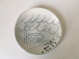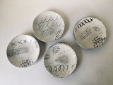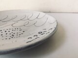 カラフルなタテ糸とヨコ糸を組み合わせて、穴やシミに合わせて縫い合わせることで、まるで芸術品のような美しい模様になるんです。私はこのダーニングが大好きで、日常的に子供たちの衣類や自分の服にチクチク針を通していたんです。ある時、ふと思いました。「うつわにもダーニングしてみたい!」そんな思いから、このシリーズの制作が始まりました。黒泥という粘土で作ったうつわに白化粧を施し、描き落としという技法でチクチクとダーニングの模様を気ままに描きました。制作していてとても楽しいです。