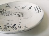 カラフルなタテ糸とヨコ糸を組み合わせて、穴やシミに合わせて縫い合わせることで、まるで芸術品のような美しい模様になるんです。私はこのダーニングが大好きで、日常的に子供たちの衣類や自分の服にチクチク針を通していたんです。ある時、ふと思いました。「うつわにもダーニングしてみたい!」そんな思いから、このシリーズの制作が始まりました。黒泥という粘土で作ったうつわに白化粧を施し、描き落としという技法でチクチクとダーニングの模様を気ままに描きました。制作していてとても楽しいです。