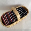 トリコロールカラーが 涼やかで 編目が 細やかで 丁寧に 編まれている。 肌触りも 柔らかで くったりしているので 畳んで 大きなバックに 入れて 持ち歩けそう。