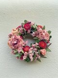 ピンク色のオールドローズと華やかなミニバラでリースを作りました。