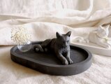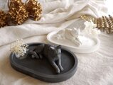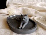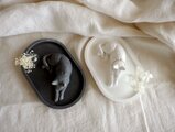 猫を乗せるのにぴったりサイズの楕円形トレー。こちらもおなじくアロマストーン製で裏面にゴム製シールをつけているので、置く場所に傷がつかず滑り止めになります。