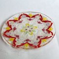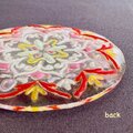一つ一つの模様を石膏に彫り、色ガラスをその溝に入れてその上に透明のガラスを乗せて電気炉で焼いて作ります。その後研磨加工してやっと完成です。