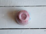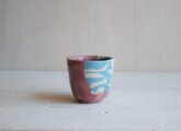 ピンクや青の濃淡のある土が景色を作る練り上げ技法のぐい吞み。