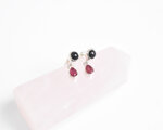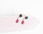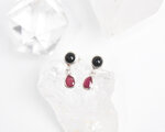 輝きが際立つファセットカットの深紅のドロップ型ルビーと、漆黒のカボションカットのオニキス。