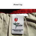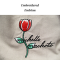 チューリップをモチーフにしたブランドエンブレムが、背面裾に刺繍してあり、とてもかわいいです。刺繍のため、エレガントな仕上がりです。また、洗濯タグはブランドタグの裏面となっており、普段は見えない仕様となっています。