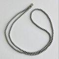こちらは貝素材の原玉に、オリジナルパール塗料にて何層にも渡り重ね塗りを施した日本製貝パールネックレスになります。パールカラーはきめ細かい質感と優しい艶感が特徴のシルバーグレー色。落ち着いた印象のオリジナルカラーです。パールサイズは直径約4mm、長さは服の上からでもゆったり着けられる全長約80cmで仕上げました。小粒ですので長さがあっても軽く、ちょっとしたお出かけに・普段使いにとお使い頂きやすいネックレスです。留め具部分にはカラビナタイプのフッククラスプを使用。