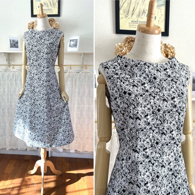 コットンリネン・大人の薔薇柄ノースリーブ・フレアワンピース『メリッサ・ボートネック・綿麻・Aライン・ロング・ローズプリント』