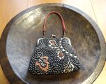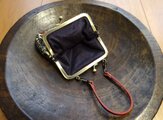 良い型染木綿から仕立てた持ち手付きのがま口ポーチです。ほとんど水を潜っていないものと思われるもので大きな難はありません。