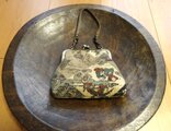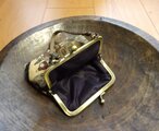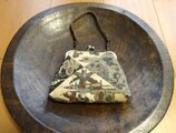 唐子柄の古い木綿から仕立てた持ち手付きのがま口ポーチです。珍しい柄ですね~